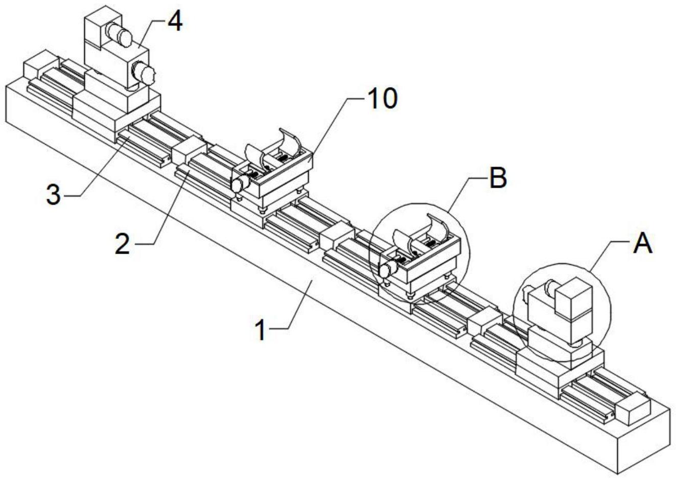 [0011]與現(xiàn)有技術相比,本實用新型具有如下有益效果:通過底座、a電動滑軌、b電動滑軌、a電動推桿、b電動推桿、鏜車頭和弧形夾板組成的組件,實現(xiàn)為金屬管件的加工提供一套同軸調(diào)節(jié)便捷的臥式鏜床機構(gòu),通過多電動滑軌的配合,可使鏜車頭與夾持工件的弧形夾板之間的作業(yè)間距實現(xiàn)調(diào)整,使本申請鏜車能夠?qū)Χ喾N規(guī)格長度的工件進行車加工處理,且基于多組電動推桿之間的升降配合,可助于工件與鏜車頭的刀具之間的加工高度進行升降調(diào)整,使工件與鏜車頭的刀頭之間更好的實現(xiàn)同軸作業(yè),使用靈活度更好,解決現(xiàn)有臥式鏜床對于鏜車頭的使用高度局限性大的問題,面對加工的工件圓心與車頭刀具的圓心高度差過大時,沒有能夠相繼對工件和車頭的作業(yè)高度分別進行調(diào)試的機構(gòu),導致加工局限性具有一定局限性的問題。
